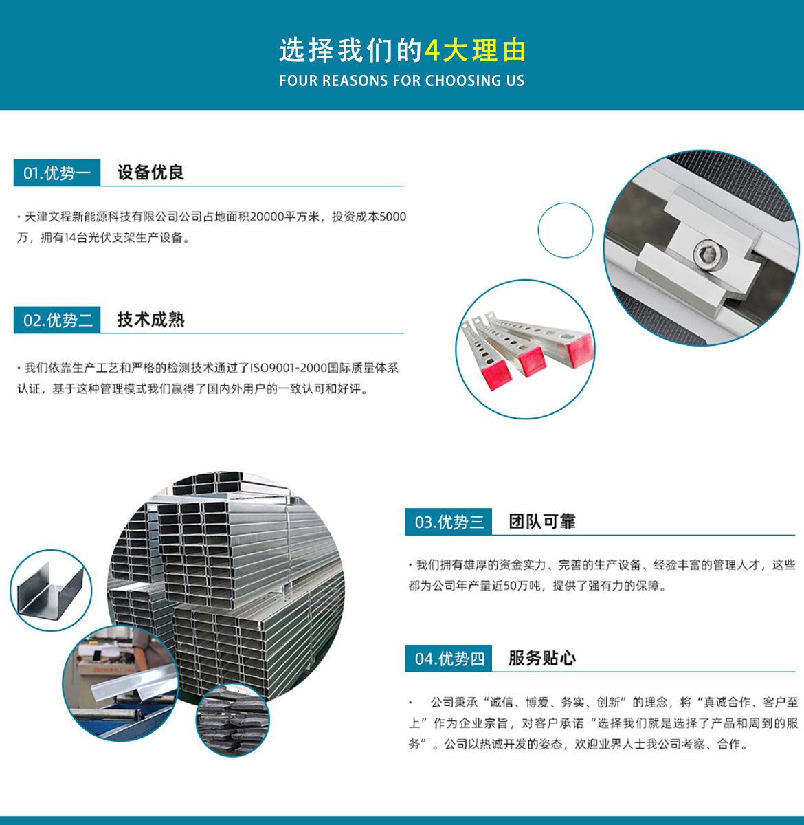 關于我們天津文程新能源科技有限公司成立于2021年,是專注于集中式、分布式、漁光互補和農光互補等清潔能源發電的綜合性企業 公司是集設計、研發、生產、制造為一體的綜合型企業。公司占地面積20000平方米,注冊資金5000萬元整。公司坐落于華北鋼鐵重鎮--大邱莊,距天津市區50公里、鄰104和205國道及京滬高速,交通十分便捷。 本公司擁有三個生產車間,其中兩個冷彎型鋼車間,一個鋅鋁鎂型鋼車間,擁有自動冷彎成型機10條,自動數控沖孔機10條以及焊接加工等設備。主要生產產品有:太陽能光伏支架、各種規格的C/Z/U型鋼、抗震支架、管廊支架及整套配件等。